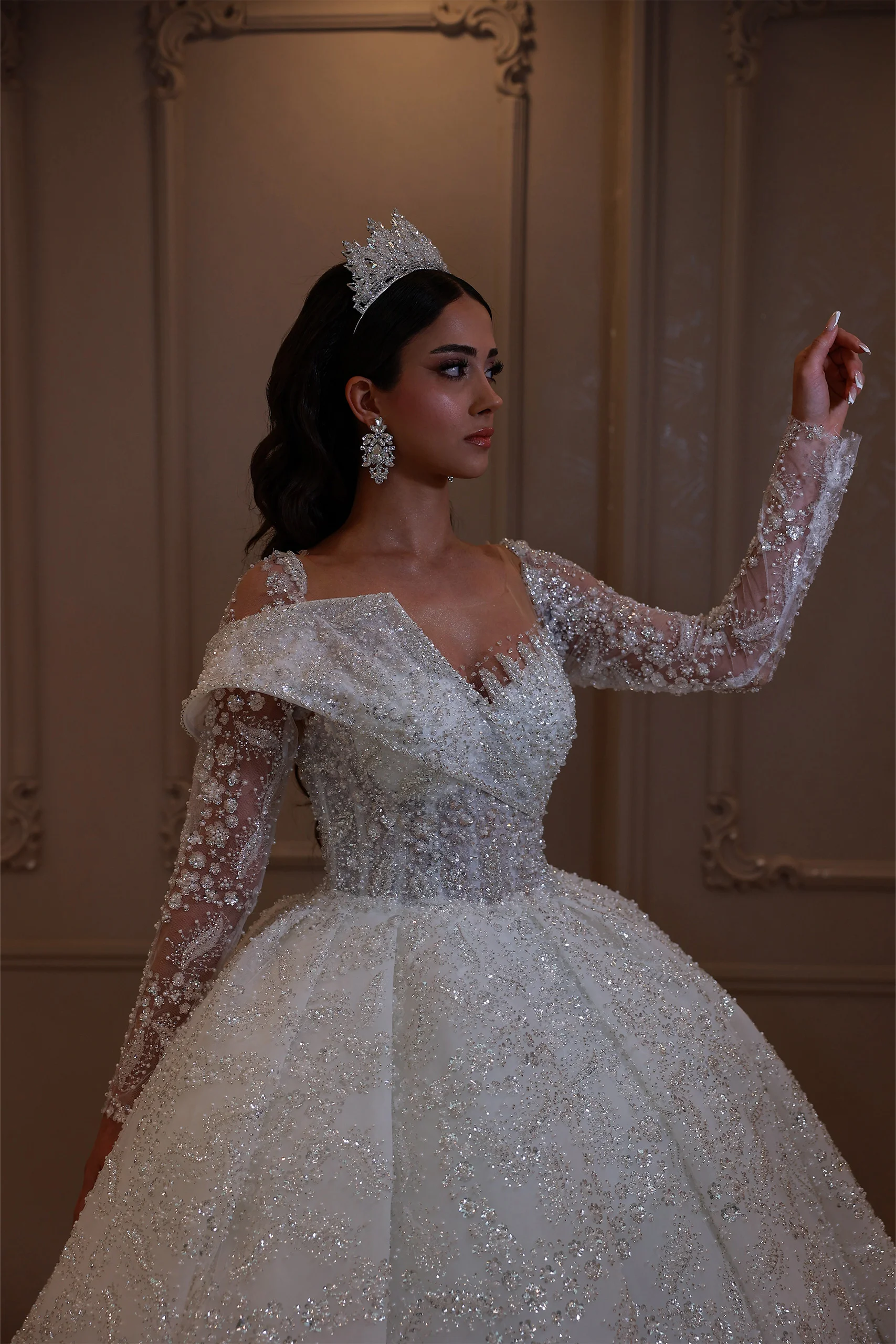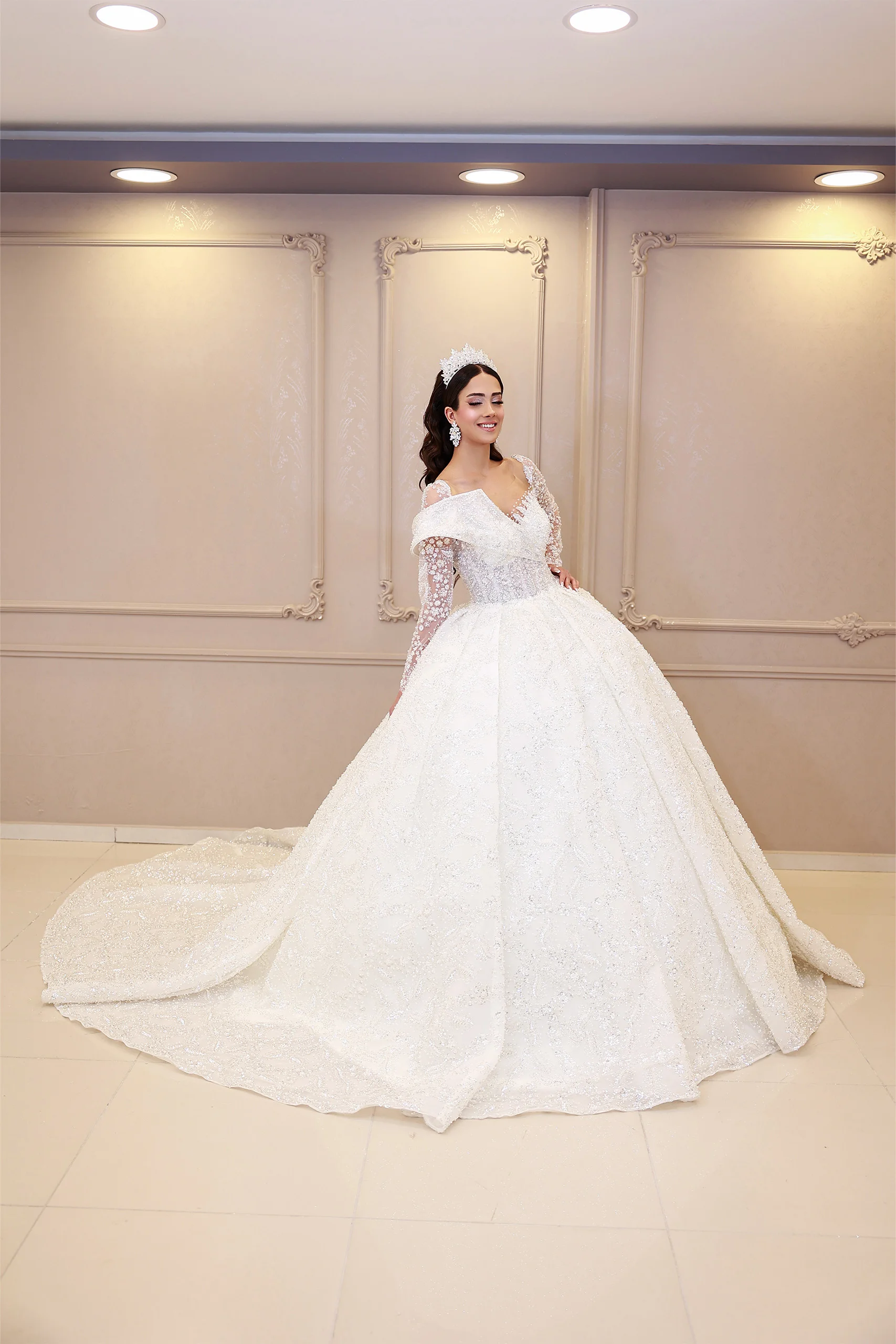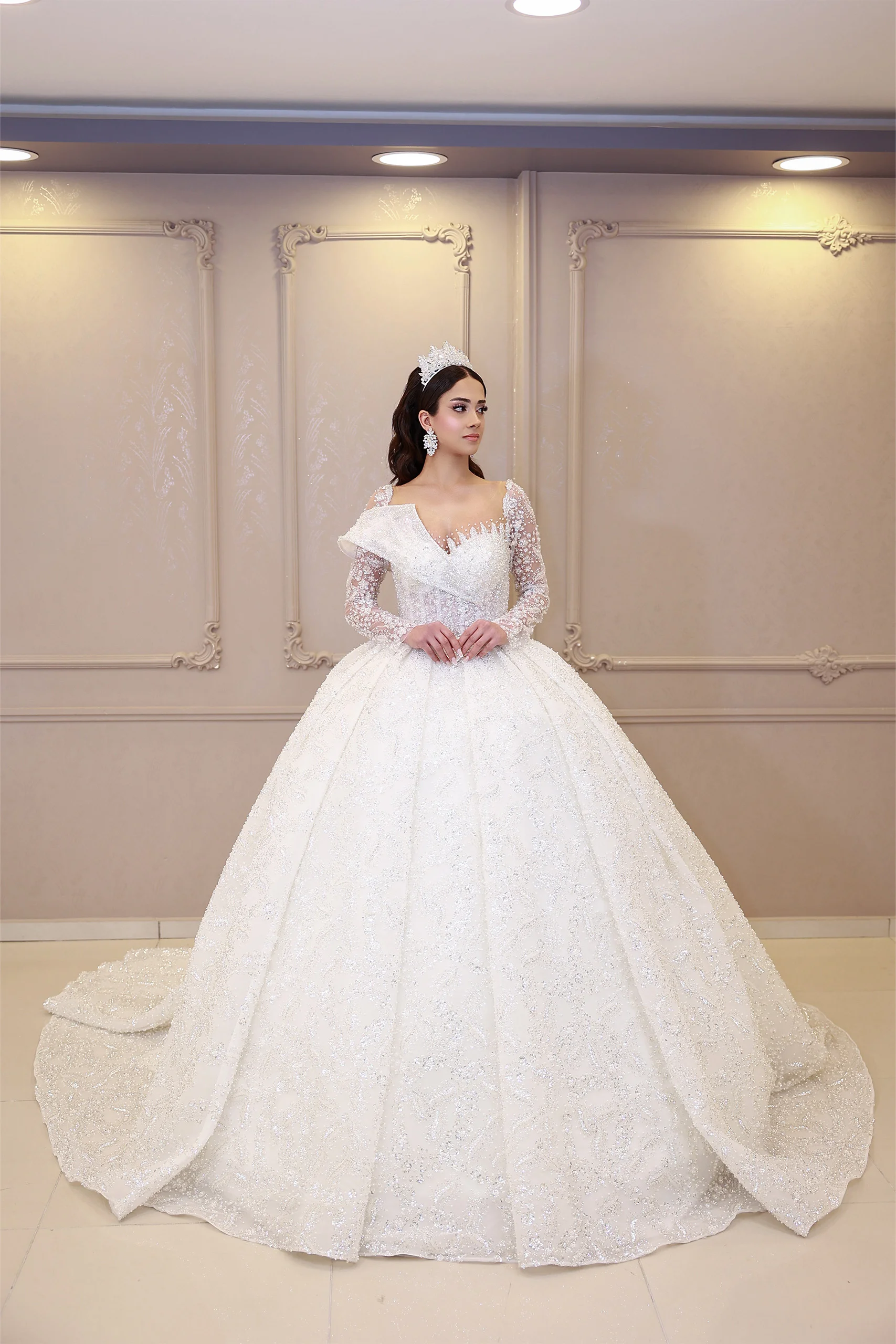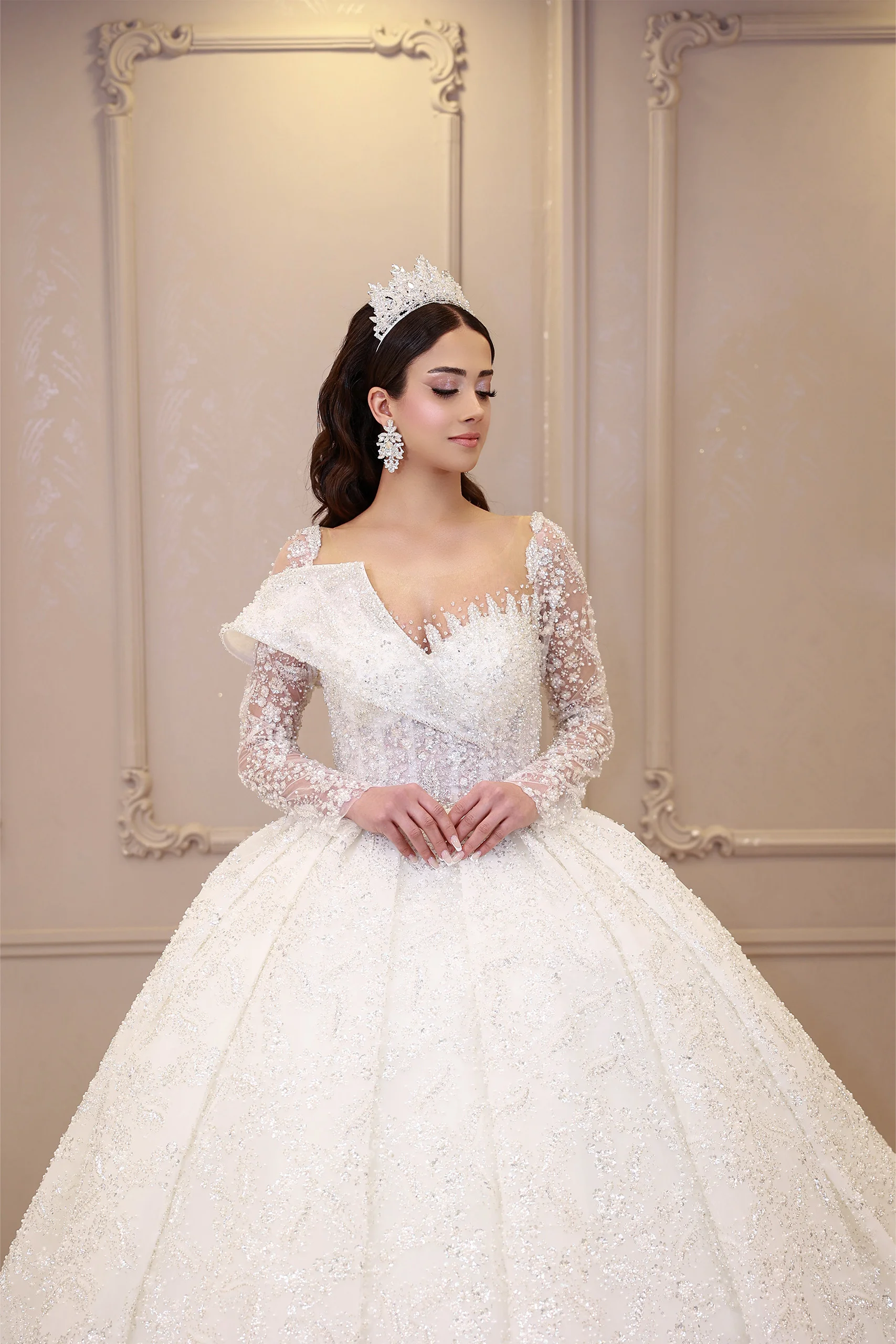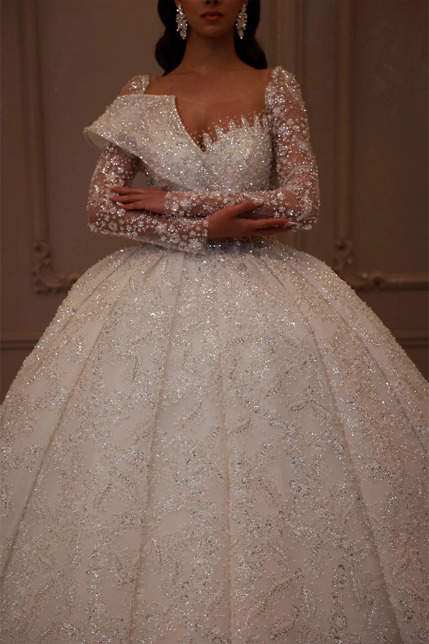 Göğüs Detaylı Uzun Kollu Prenses Model Gelinlik