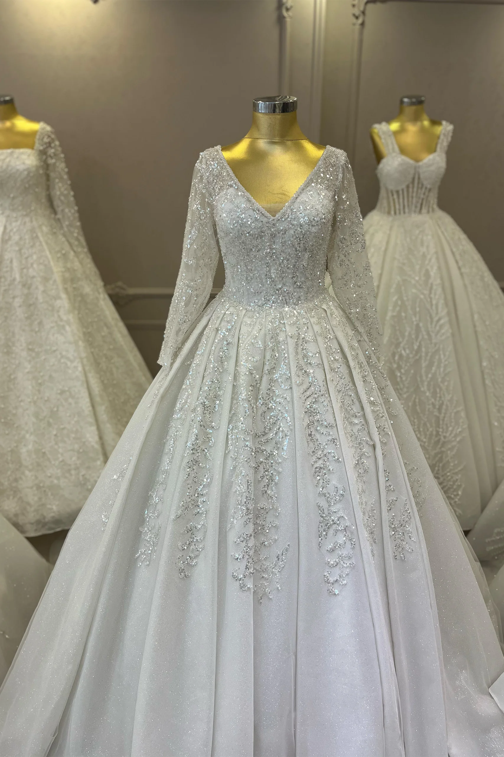 Uzun Kollu Taşlı Prenses Model Gelinlik